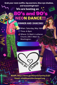 Who is ready for another upcoming Hearts for Change dance?!?!?!?! Grab your neon outfits, leg warmers, blue eye shadow, teased high hair, and let’s celebrate the 80’s and 90’s with a NEON DANCE!!!!
